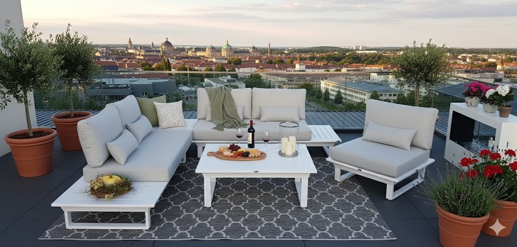 Wetterfest & robust – Aluminium, Teakholz, Keramik & UV-beständige Stoffe
